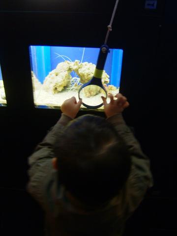 凪の好奇心をそそる「虫メガネ」コーナー。乙姫エビを拡大中。