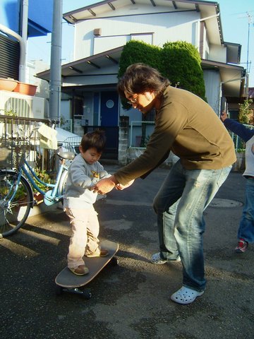 初めてのスケボー。急坂の多い羽沢では見たことないアイテムだね。
