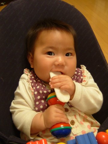 くいしんぼうの宝さん。2回食の時期だというのに、だれかが食事するたびにおねだりおねだりです。