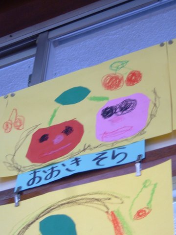 四角い紙の角を切って丸を作る、という工作でさくらんぼを作ったんだって。ね、目大きいでしょ。
