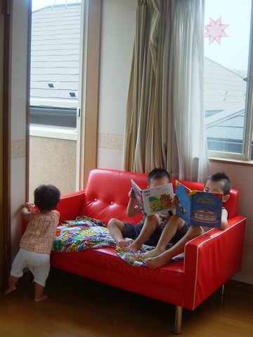 ベランダのドアを開けて、ここにソファーをもってくると風が抜けて最高に気持ちいいことが判明。ベランダの網戸買おーっと。