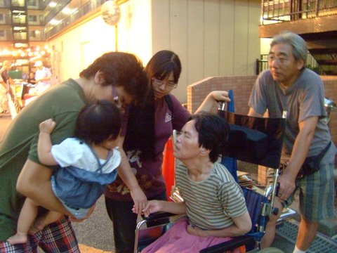 おじいちゃんおばあちゃんは散歩帰り。宝も早速ごあいさつ。