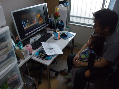 すっかりプーさんにはまった宝。恐いはずの貴史もプーさんを見せてくれるなら抱っこOKw